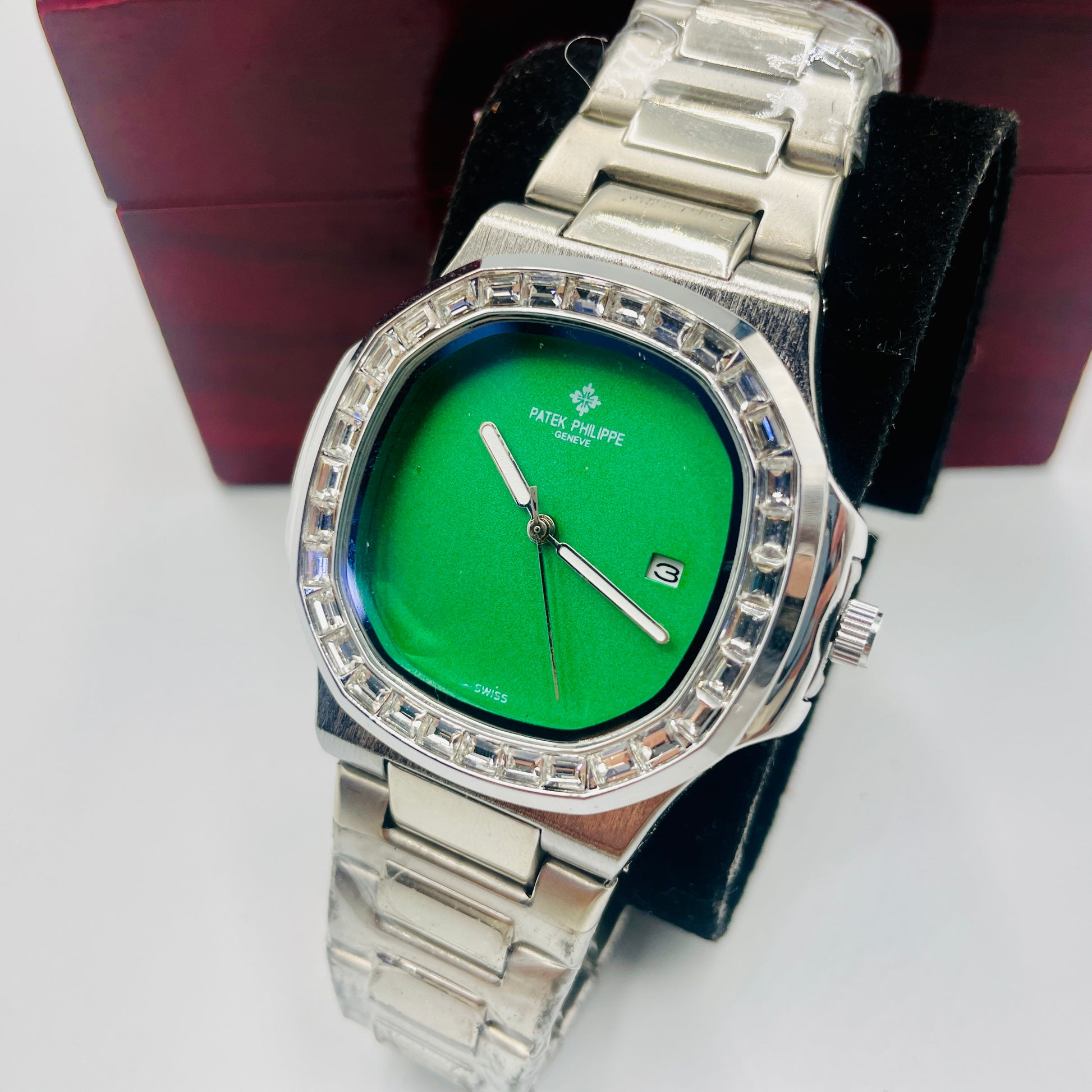 Patek Silver Green Stones Watch